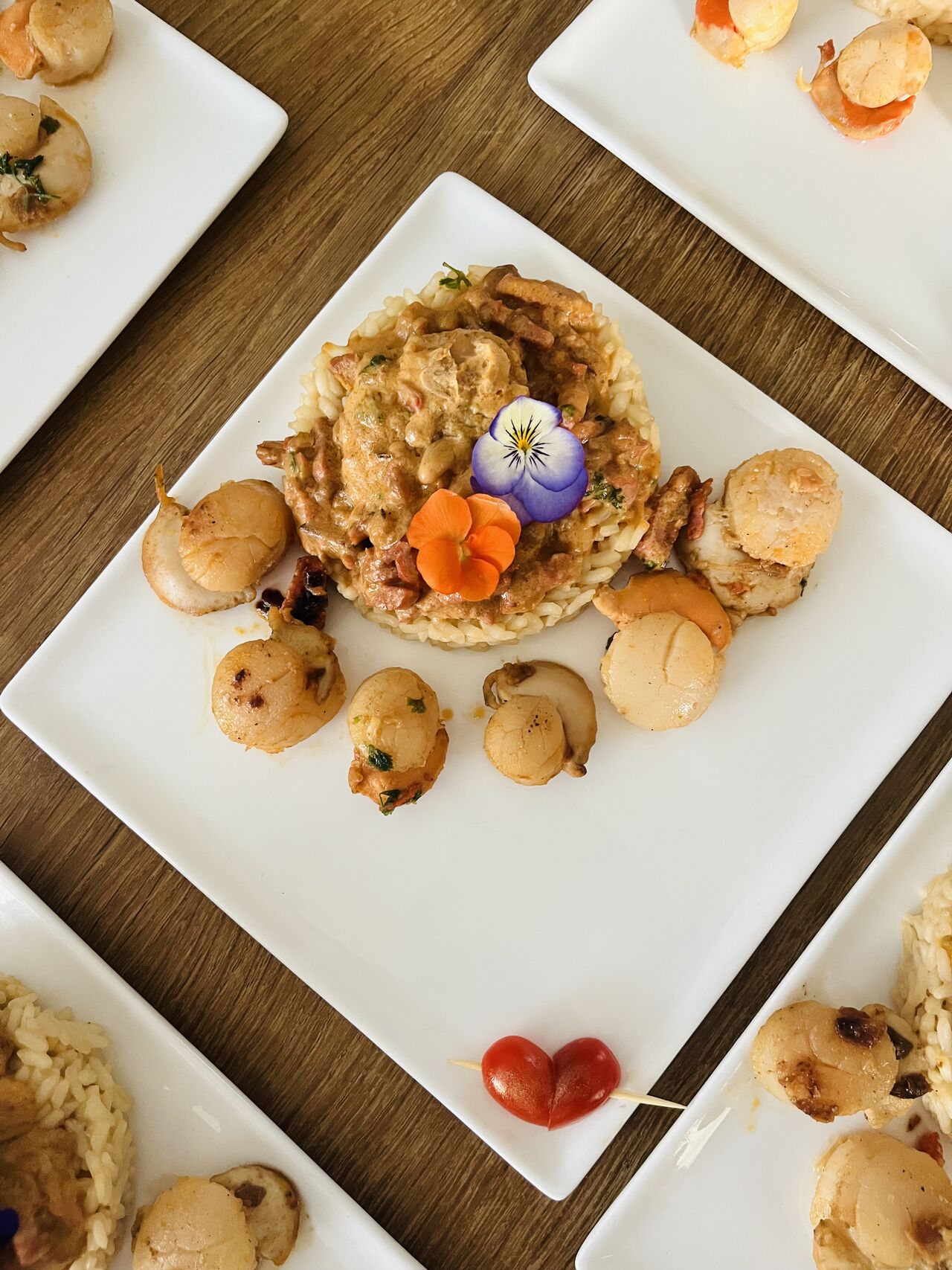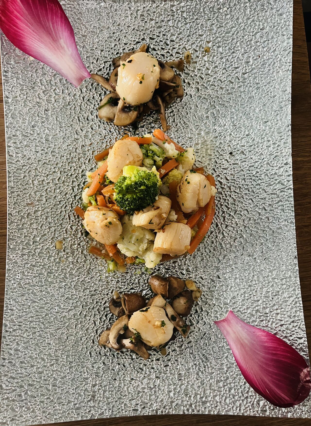 ~ poêlée de Saint-Jacques, flambées sur son lit de Poireaux et sa purée de patates douces